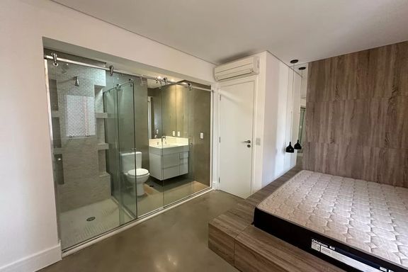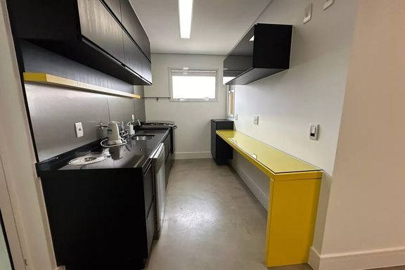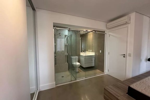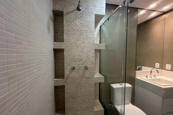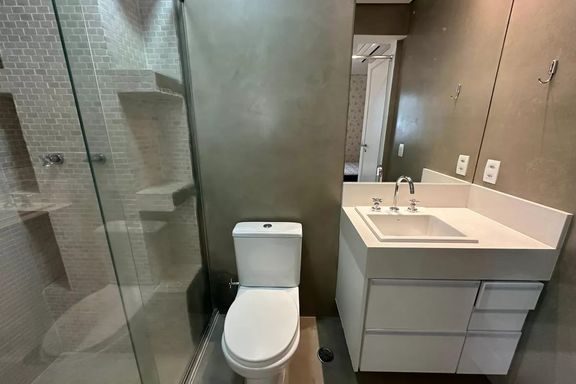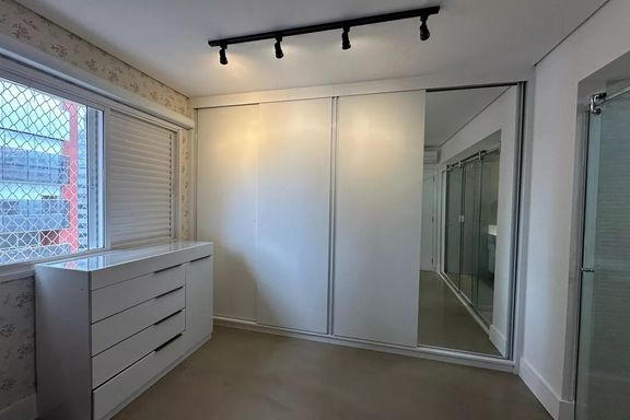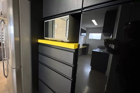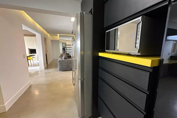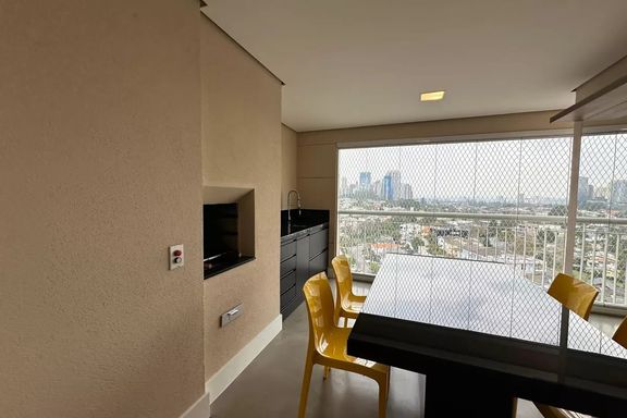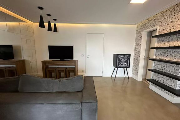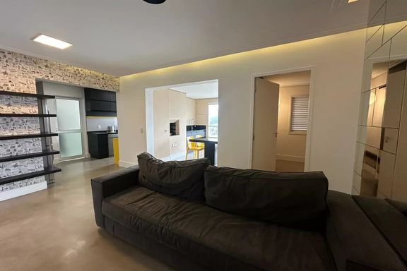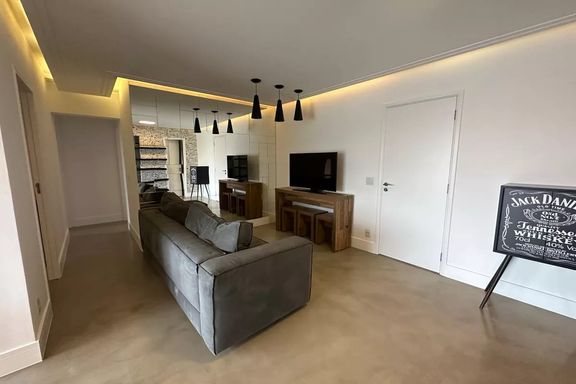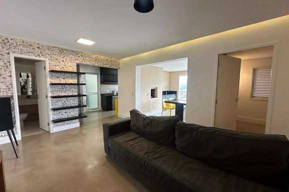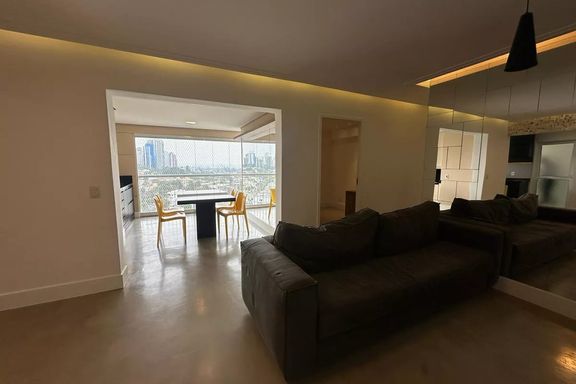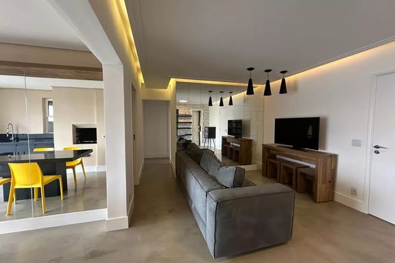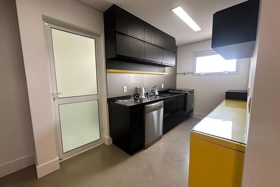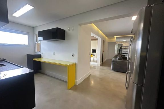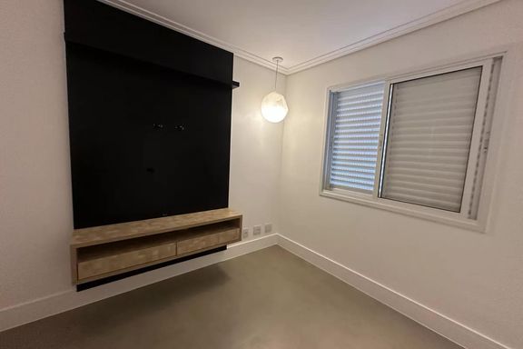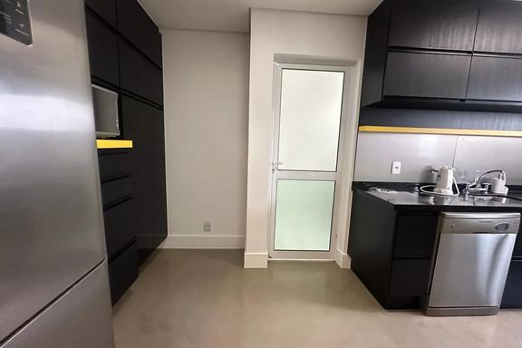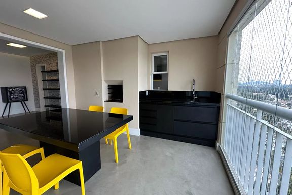 Belo apartamento para locação com 3 dormitórios, sendo 2 suítes, mobiliado, sala de estar, sala de jantar com janela ampla de de vidro com vista linda para condomínio Alpha Plus, cozinha, lavanderia.