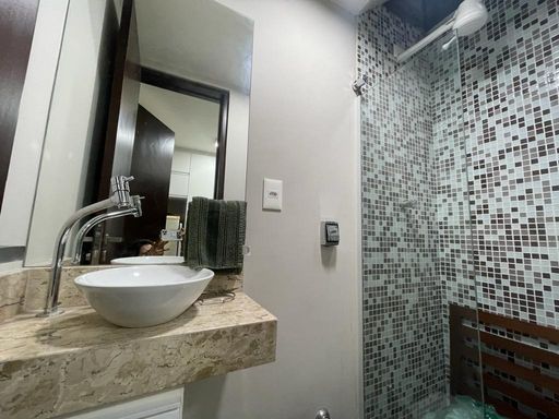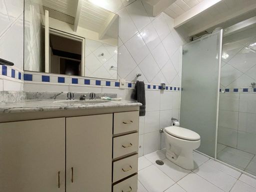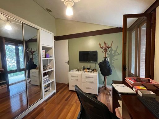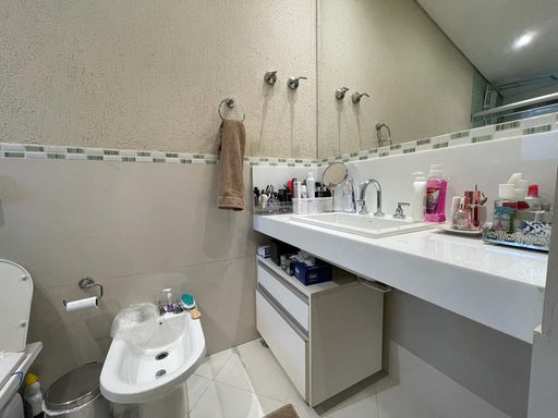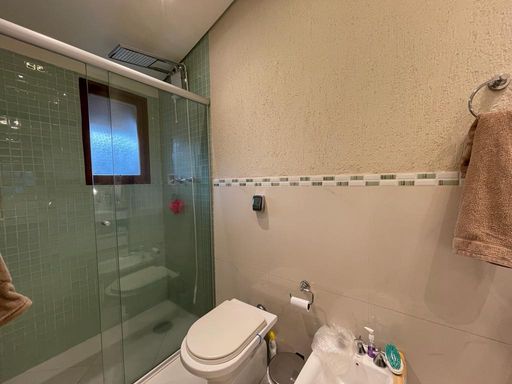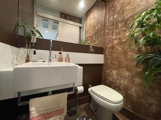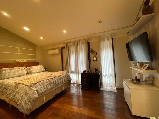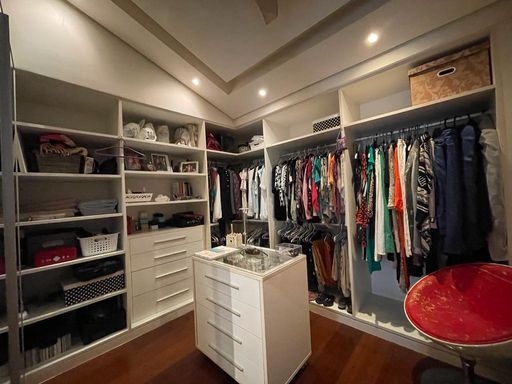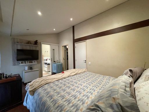 A suíte principal passou por uma ampla transformação, ganhando um closet espaçoso integrado ao banheiro ampliado, que conta com revestimentos e metais novos de alto padrão.