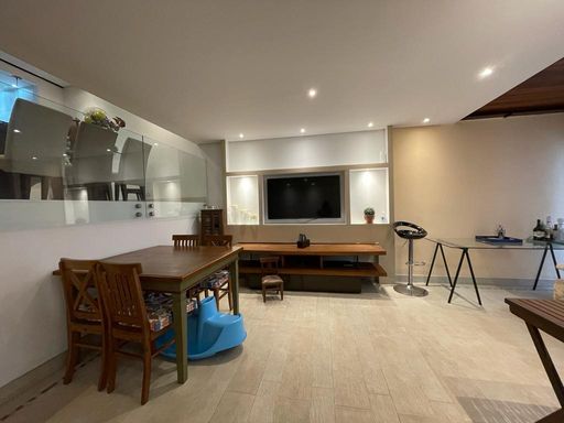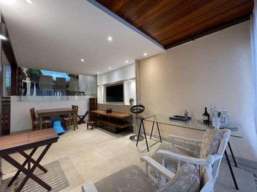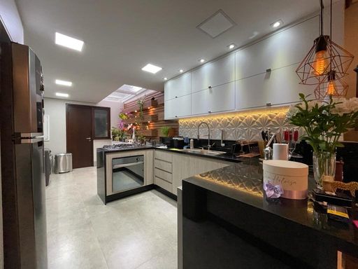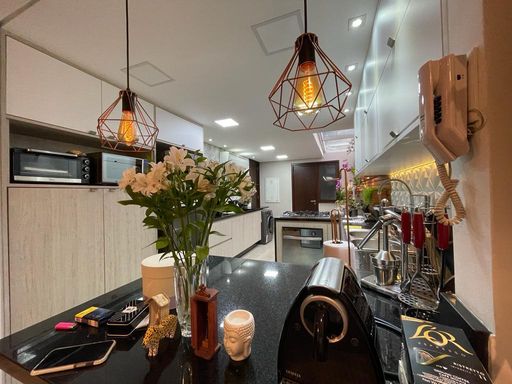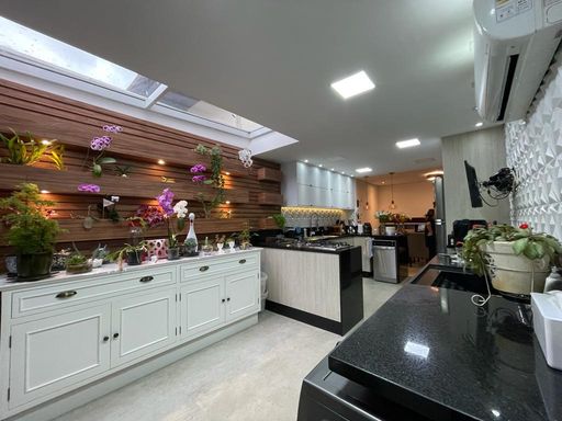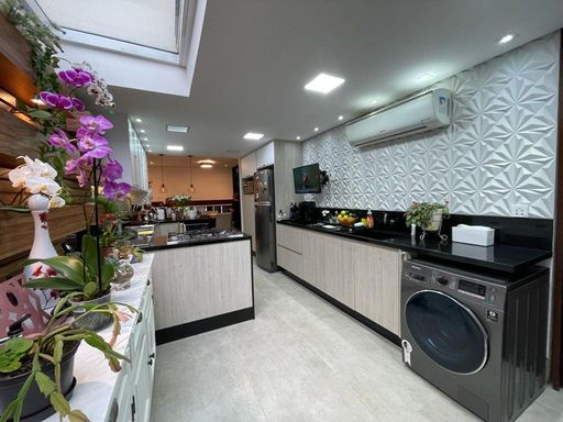 A cozinha foi completamente reformada, ampliada e integrada à sala de jantar, recebendo novos revestimentos e pisos.