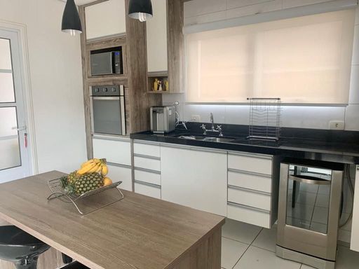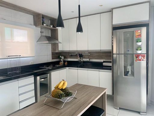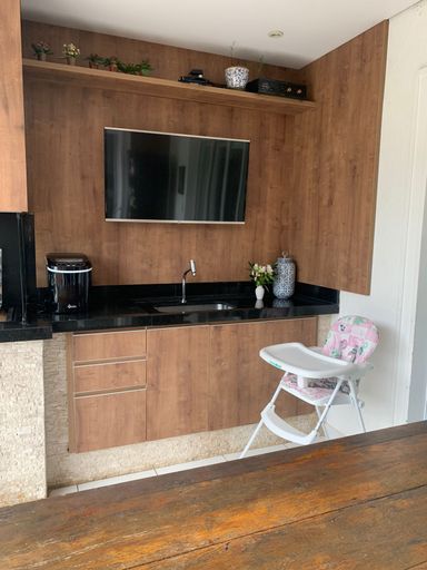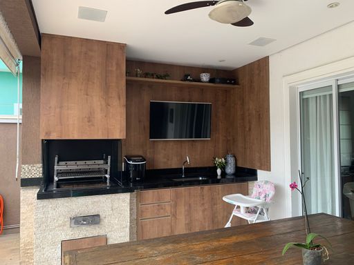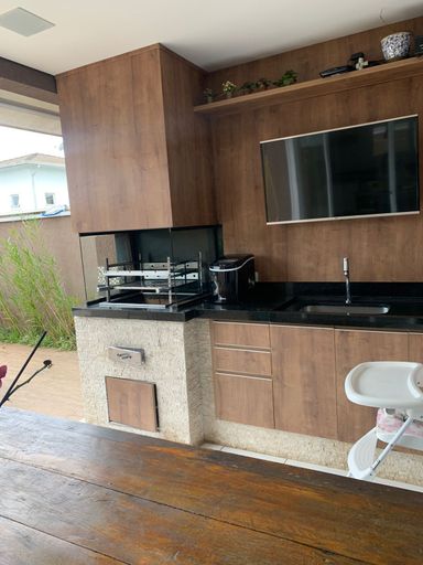 A cozinha é integrada à área de churrasqueira, perfeita para receber amigos e familiares.