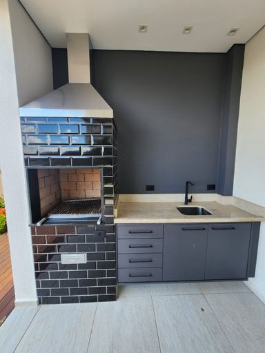 Varanda gourmet integrada, com churrasqueira e total integração aos ambientes sociais