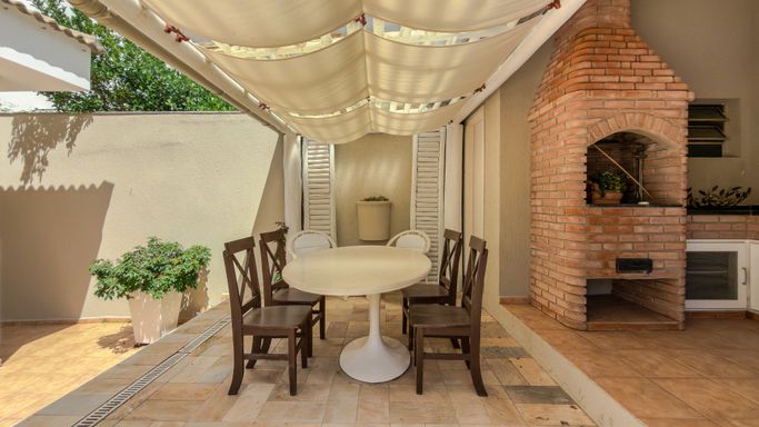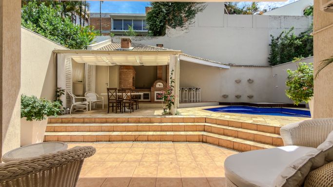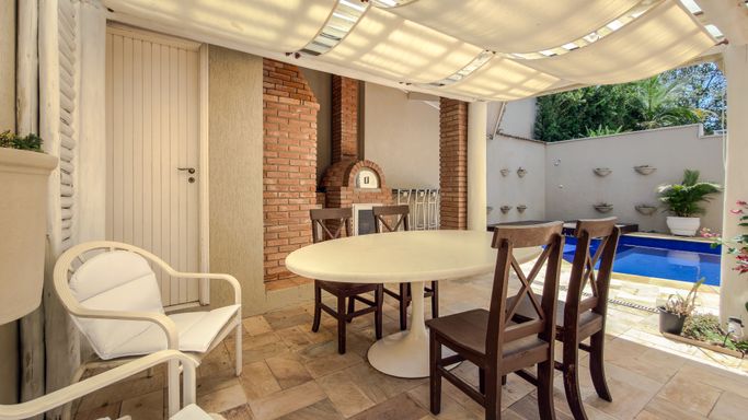A área externa é ideal para receber, com espaço gourmet equipado com churrasqueira e forno de pizza, além de banheiro completo para atender a piscina.
