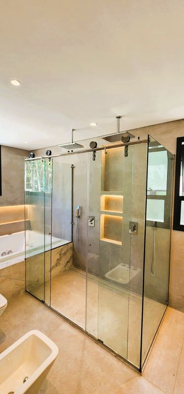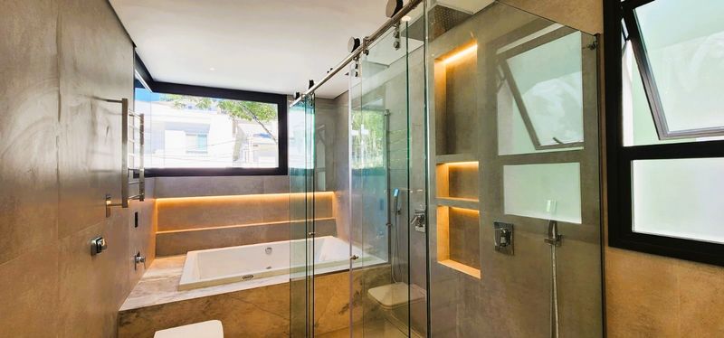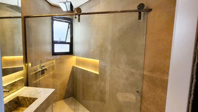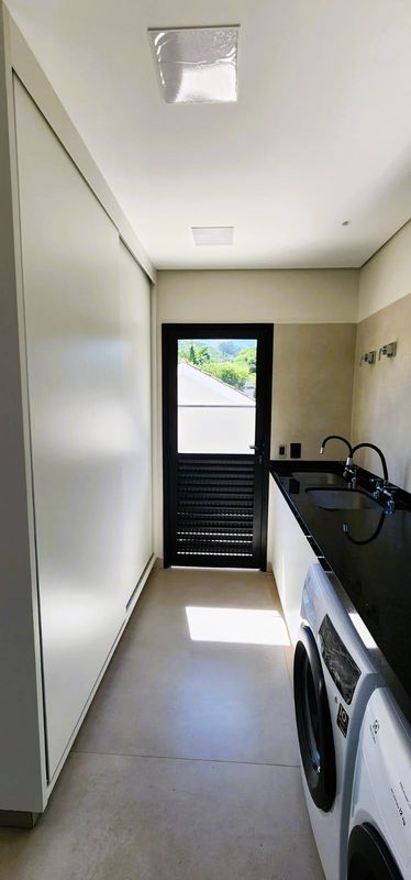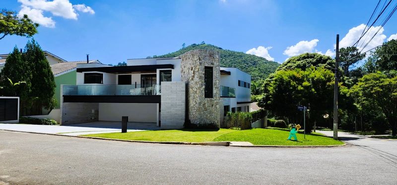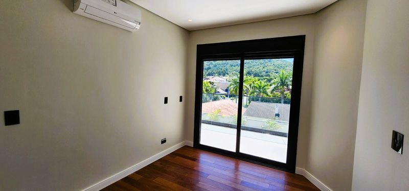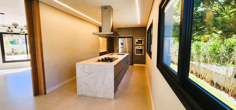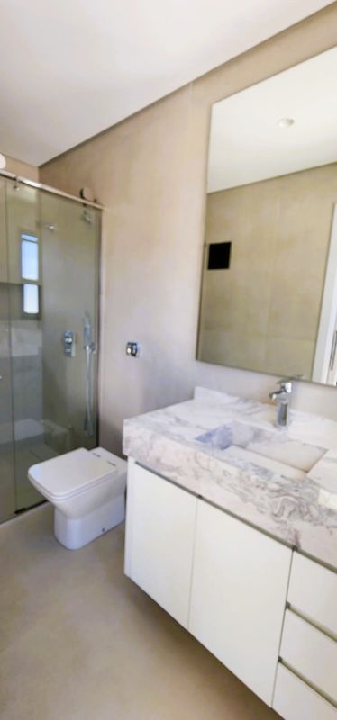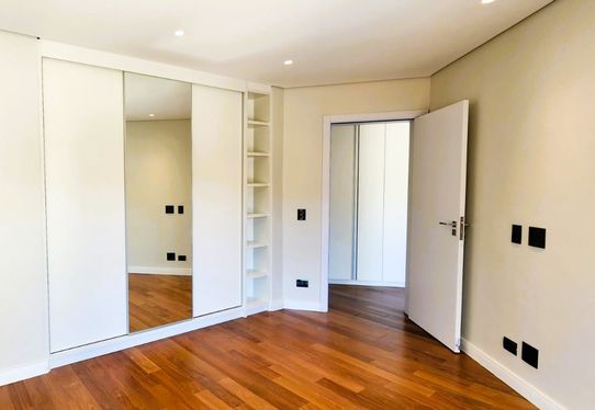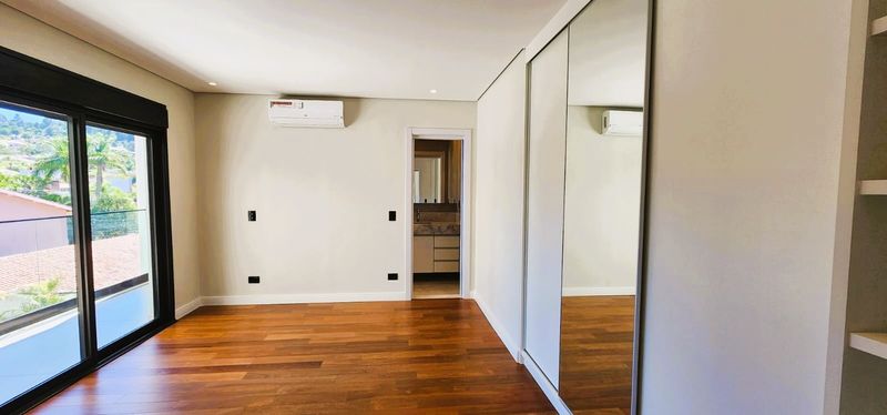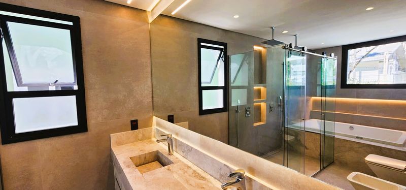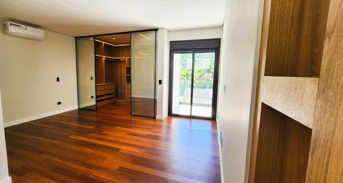 São 4 suítes amplas, todas repletas de armários embutidos. A suíte master é um verdadeiro refúgio, com closet espaçoso, banheira de imersão, ducha Sr. e Sra., além de box e espelhos em todos os banheiros. O piso superior conta com piso de madeira maciça em cumaru, persianas automatizadas e uma charmosa copa de apoio em mármore Branco Paraná.