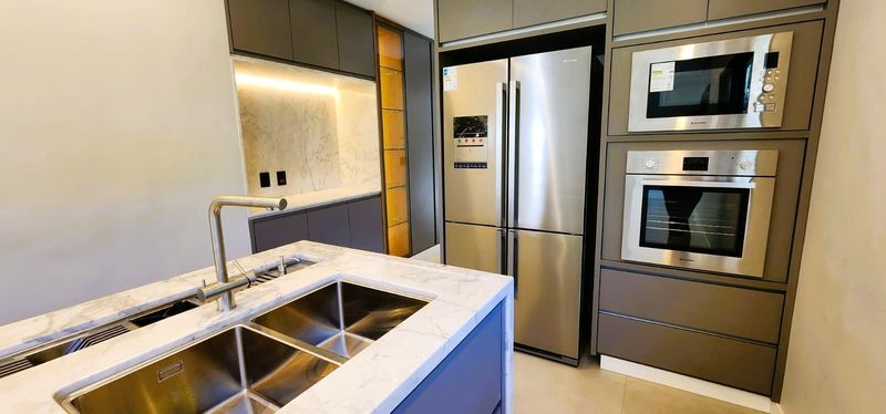 A cozinha é completa, equipada com armários planejados e eletrodomésticos embutidos (forno e micro-ondas), integrando funcionalidade e design.