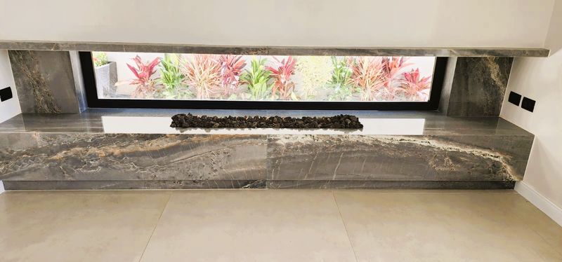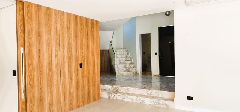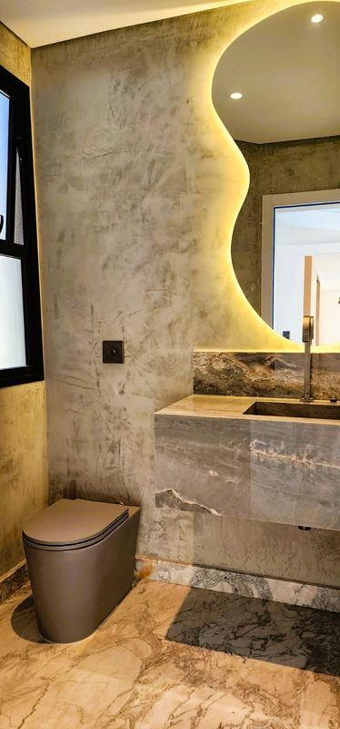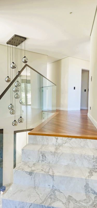 A área social impressiona com sala para três ambientes, lareira a gás com sistema de segurança contra apagamento, escritório, hall de entrada e escada revestidos em mármore Branco Paraná, trazendo elegância e luminosidade aos ambientes.