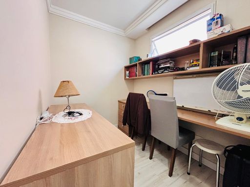No pavimento superior, três dormitórios climatizados — incluindo uma suíte — asseguram conforto e privacidade. Todos os ambientes possuem armários planejados, reforçando a praticidade e o cuidado no acabamento. Uma sala íntima e um escritório complementam o andar, oferecendo espaços versáteis para descanso ou trabalho.