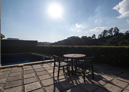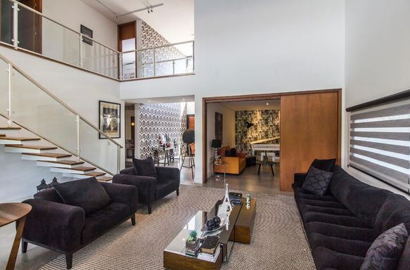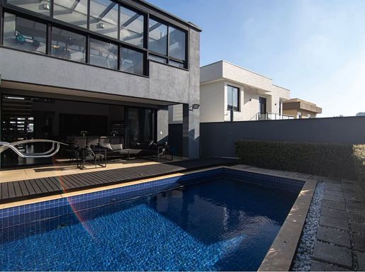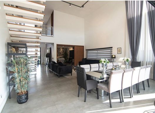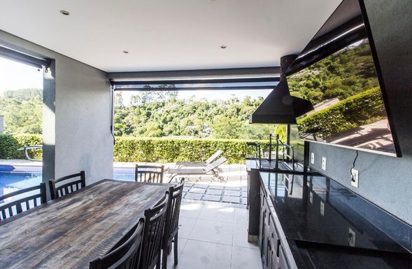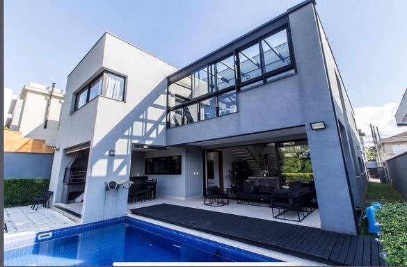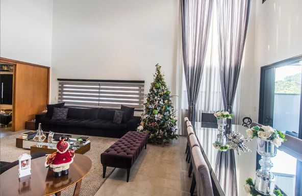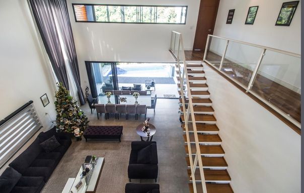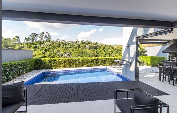 Logo na entrada, o imóvel impressiona com pé-direito duplo, presente também na sala de estar e jantar, que se integram harmoniosamente à área externa, à piscina e à vista privilegiada. Ambientes amplos, iluminados e acolhedores.