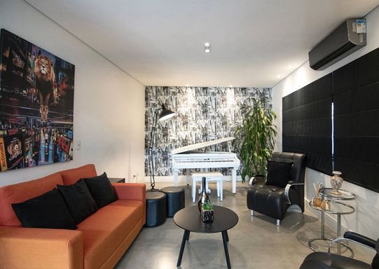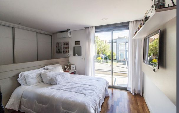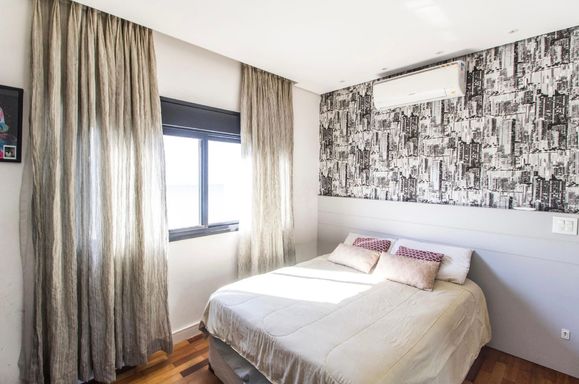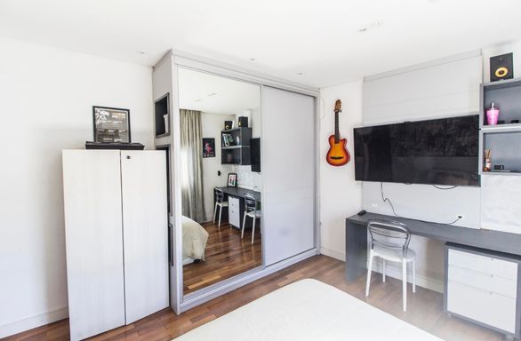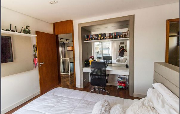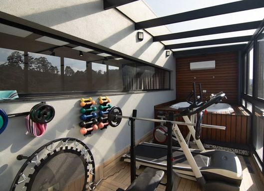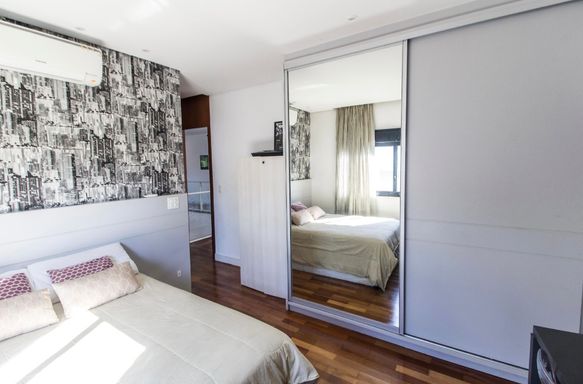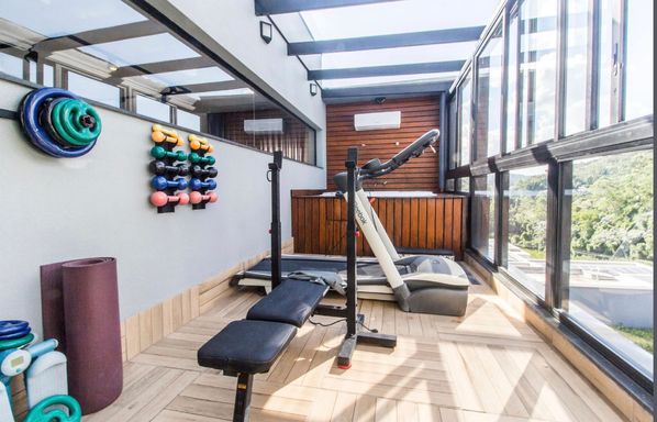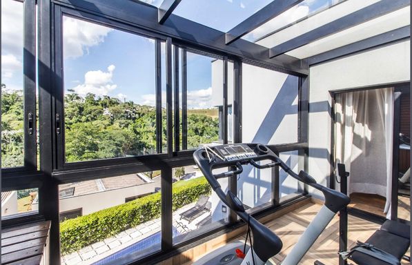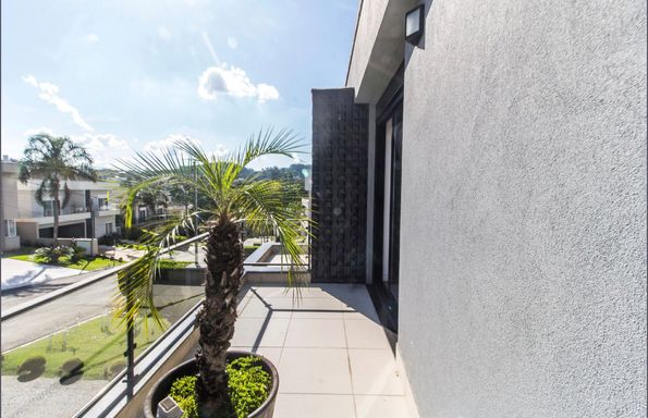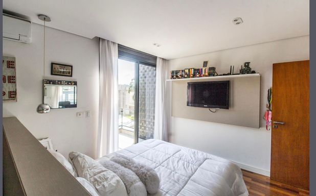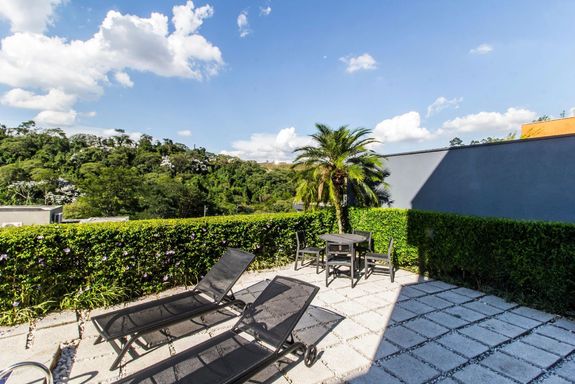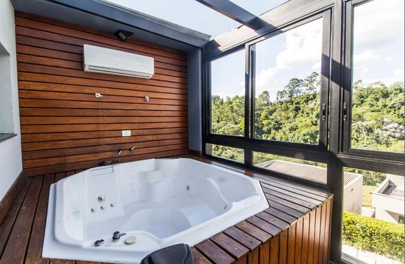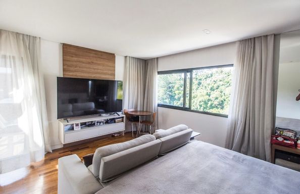 A suíte master é um verdadeiro refúgio, com dimensões generosas, closet espaçoso, pias e chuveiros duplos. Possui ainda uma sacada fechada com vidro e jacuzzi com vista direta para a mata, proporcionando momentos únicos de relaxamento.