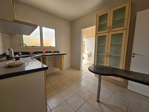 Cozinha com armários, lavanderia e suíte para funcionário.