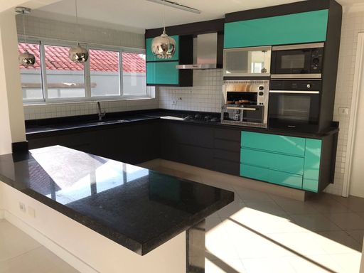A área social é ampla e bem distribuída, composta por quatro salas: sala de jantar, sala com lareira, sala de TV e uma charmosa sala bar com pia. A cozinha gourmet interna segue o conceito aberto e é equipada com churrasqueira a gás, forno elétrico e micro-ondas embutidos, proporcionando praticidade e integração aos ambientes.